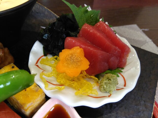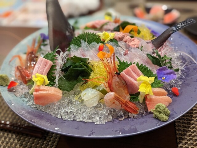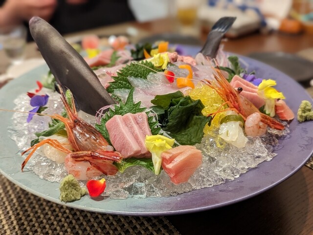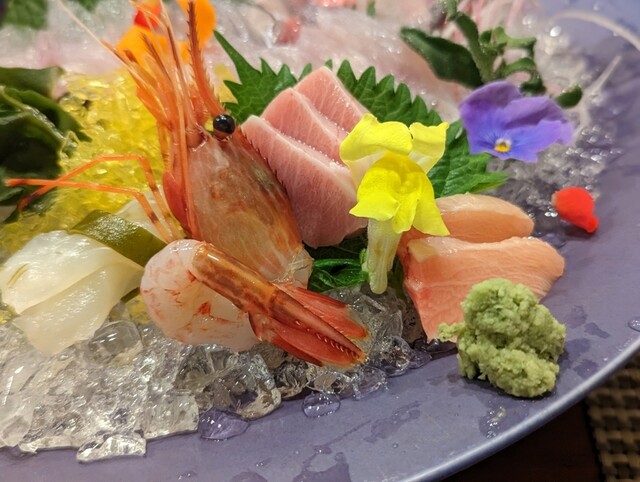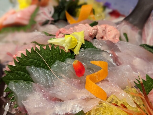 お刺身盛り合わせは、色とりどりのあしらいで盛り付けてあり、見た目も素晴らしくて、食べる事がもったいなくなる料理です