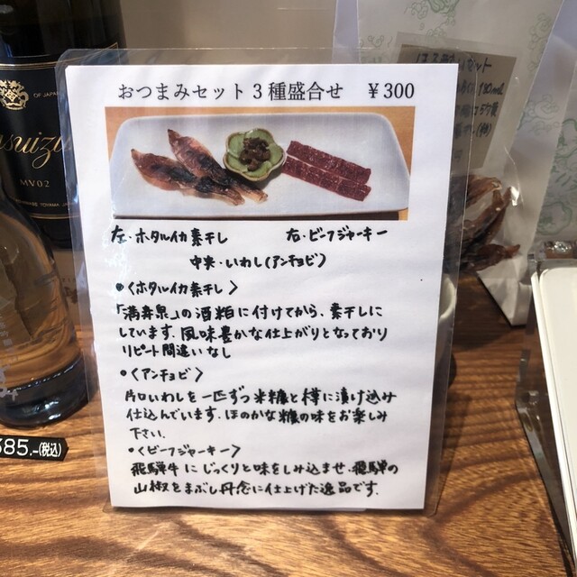 迷った末に、木桝を買うことにした。杉の香りを含んだ枡は、あとで持ち帰っても余韻が残る。おつまみも頼んだ。「おつまみセット3種盛り合わせ」とあった。