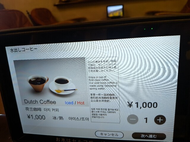 室堂に着いた時、嵐がひどく、どこにも行けなかったので、ホテル二いくまでの間に憧れのダムシフォンケーキに水出しコーヒーをいただきたく、結構待っている人はいたのですが、順番待ちをしました。