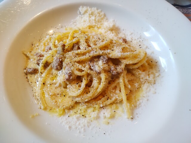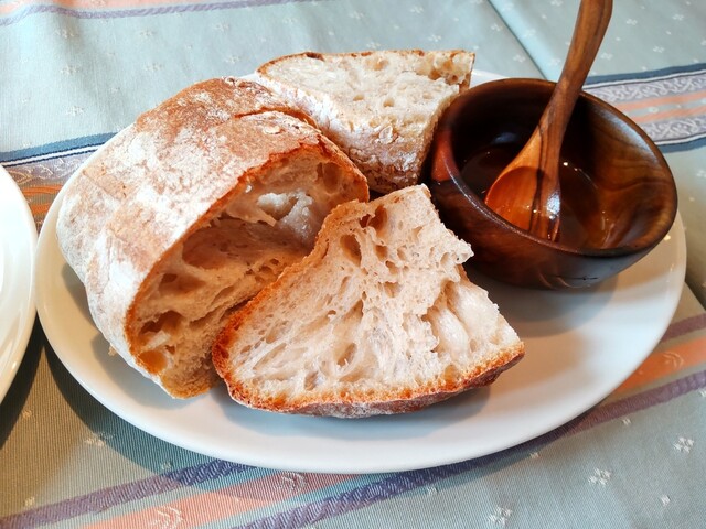 週末18時頃予約して訪問です。一軒家レストランです。一階の入口から入ると天井の高い店内。テーブル席が席間広めでたくさんあり、広めの席もゆったり使えました。メニューを見ますとピザ、パスタ以外にも美味しいそうな前菜など多数。コース料理もいくつかあり、運転手さえいればワインなどでのんびり食事できそうでした。