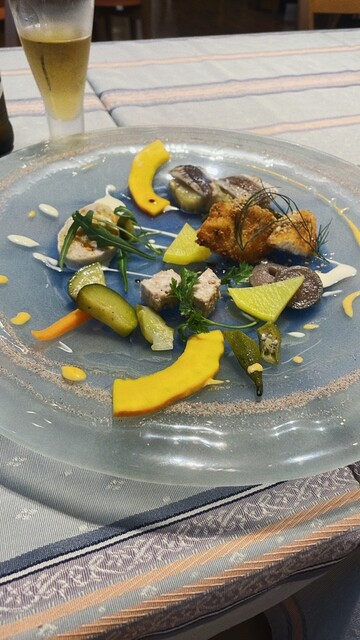 前菜盛り合わせは、大きなお皿に上品に料理が載ってます。野菜やお魚のフリットなど量は少なめですが...