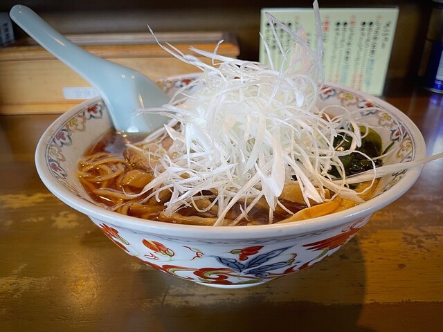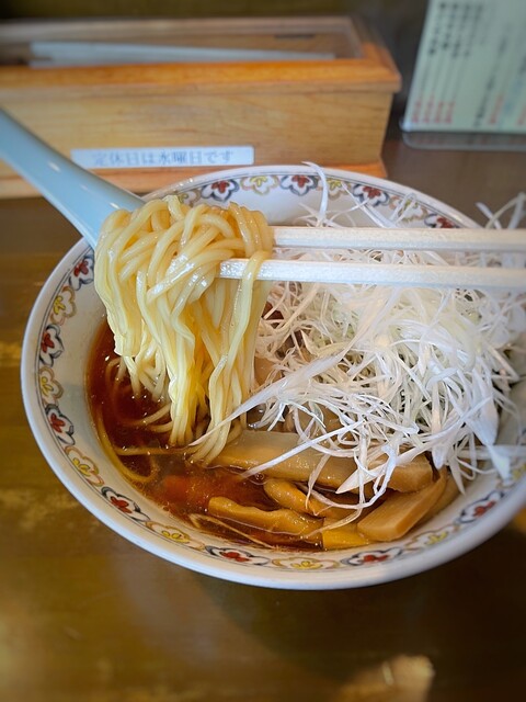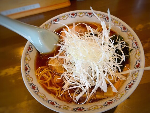 白髪ネギとワカメ、そして大きなシナチクがすごくマッチしています。