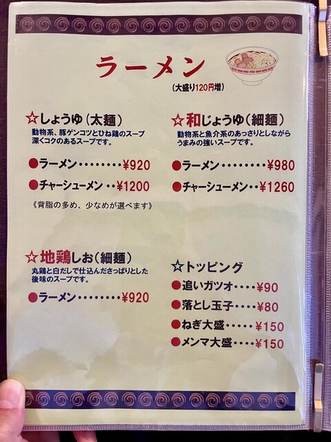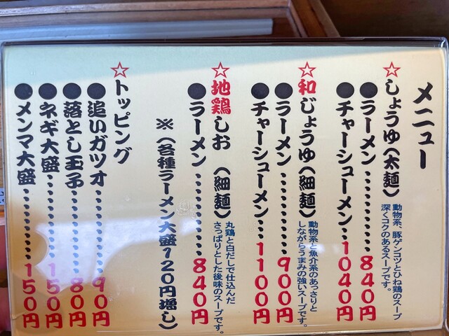 ラーメン種類は3種類。 しょうゆ(太麺)、和じょうゆ(細麺)、地鶏しお(細麺) です。