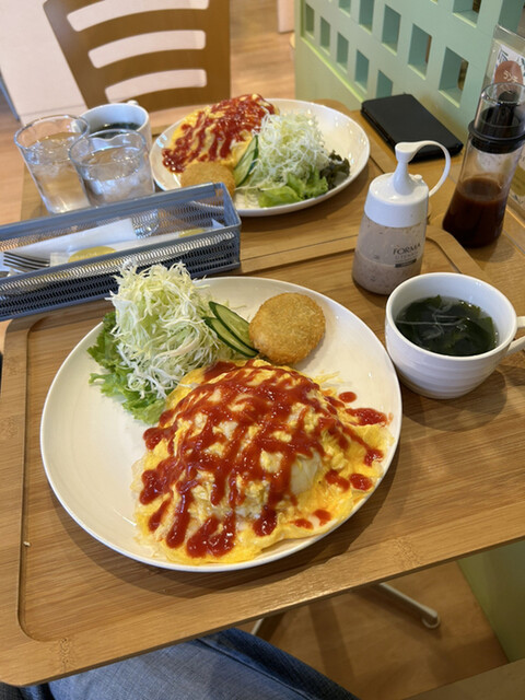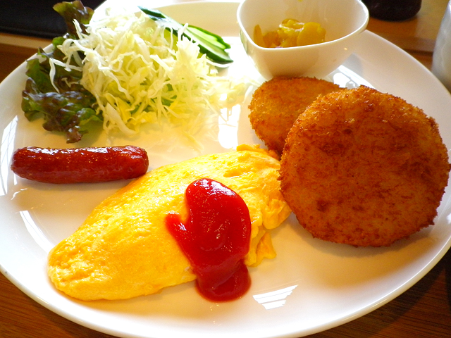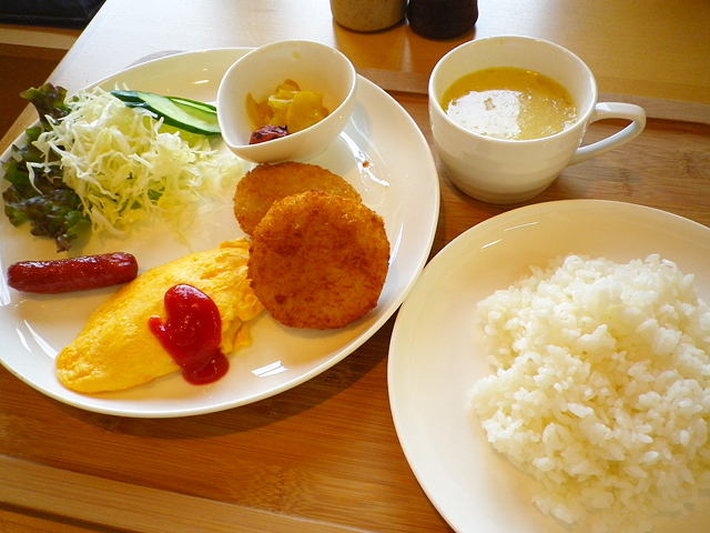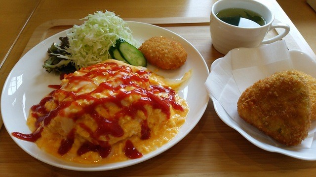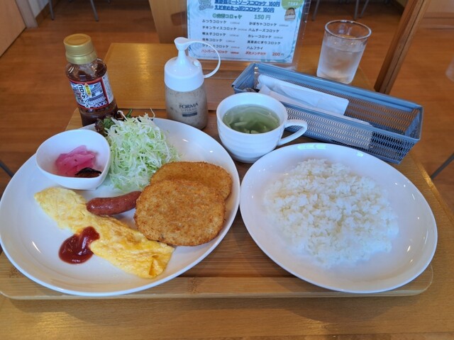 コロッケ定食はコロッケ二種を選べてごはん、オムレツ、ミニサラダ、スープがついて800円とリーズナブル。スタッフの女性の方も丁寧な対応です。