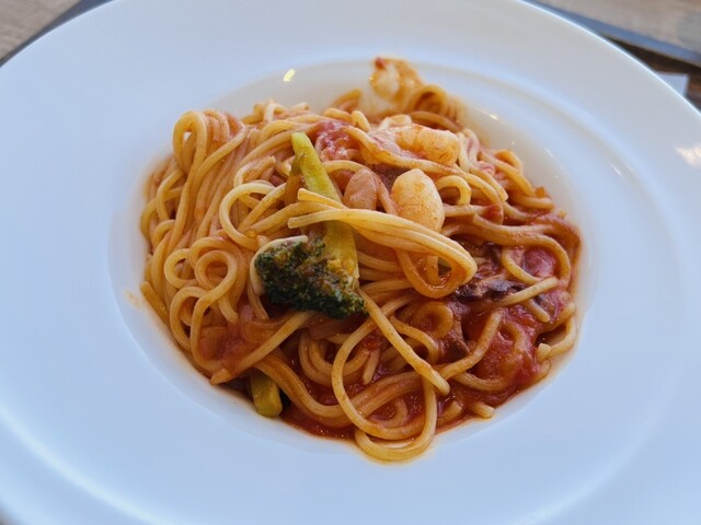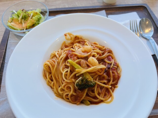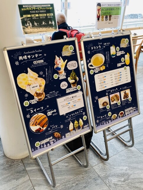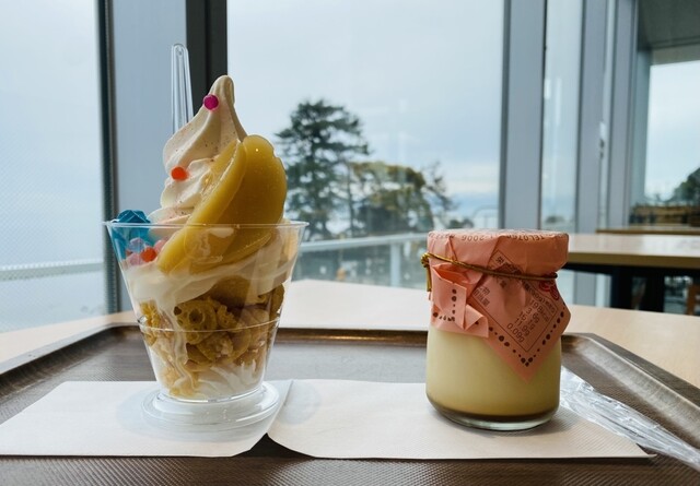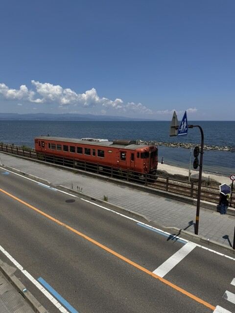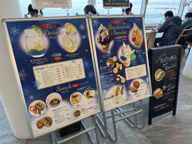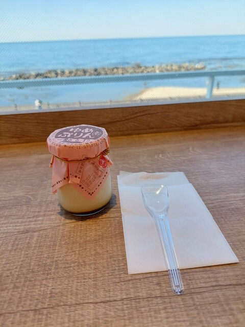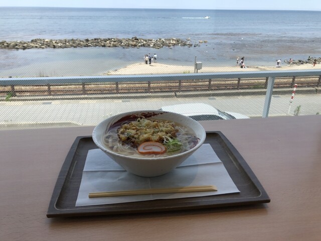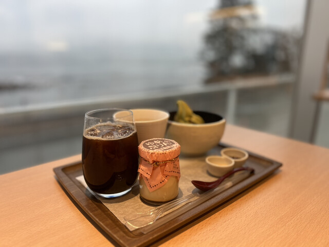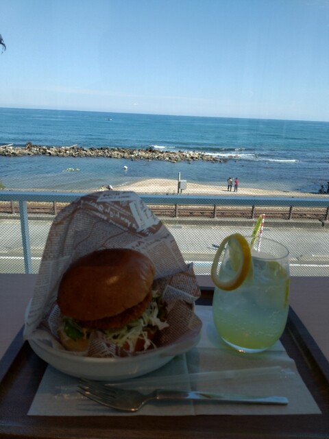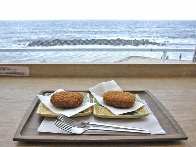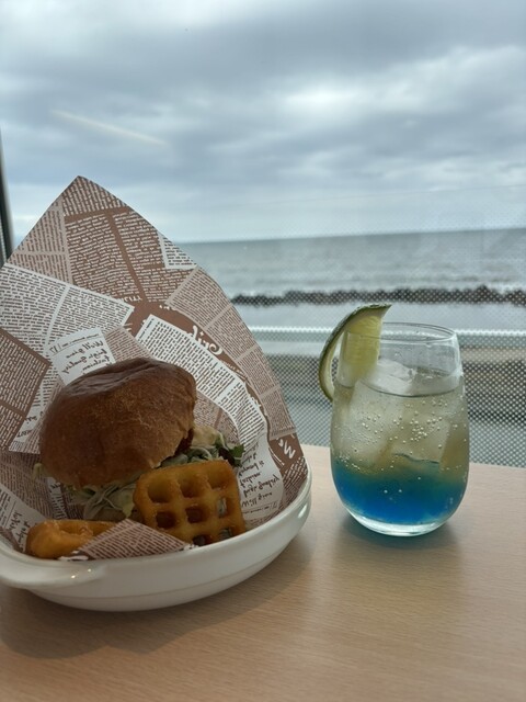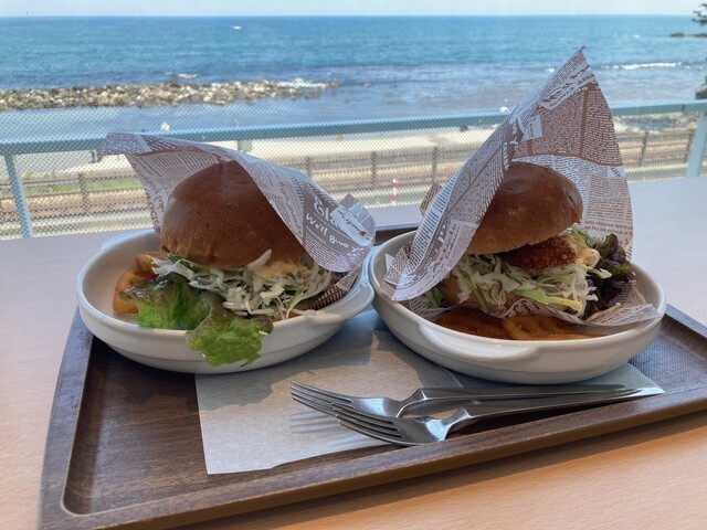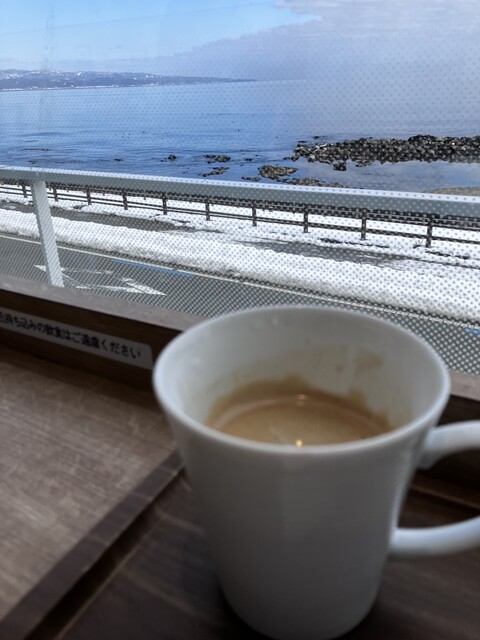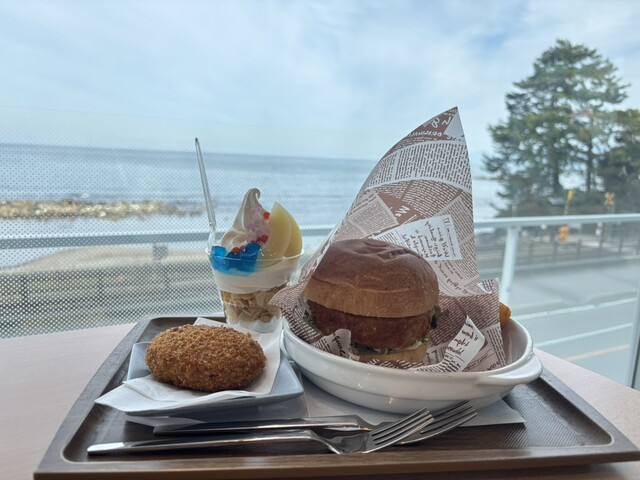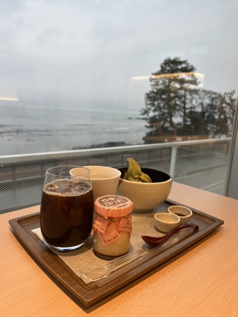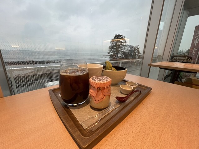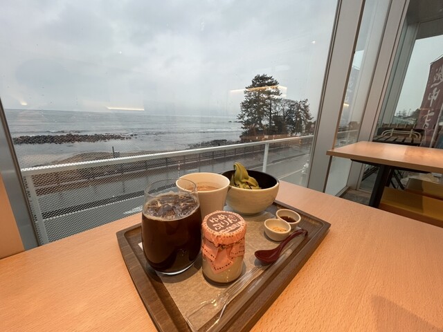 雨晴駅から徒歩5分くらいのところにあるカフェ。道の駅の2階に入っていて、富山でも有数の、日本海の絶景が見られるスポットなのですが、残念ながら小雨模様(悲)。平日12時少し前に訪問したところ、天候のせい...