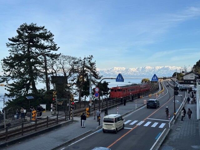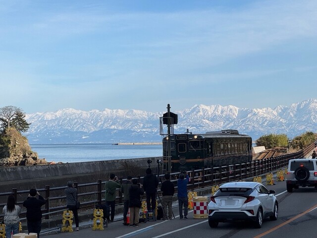 この日は良く晴れ、1時間に1本程度のJR氷見線の列車が海沿いを通る背景に立山連峰がくっきり見えて、見映え抜群でした。