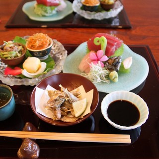 【水族館裡游泳的海鮮與赤穗溫泉的溫暖】我們將根據您的喜好,烹調20種以上的瀨戶內魚類。請品嚐來自坂越的牡蠣、鱧魚、章魚、穴子等四季食材。宴會最多可容納120位客人。