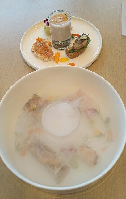 我一個人來這裡用午餐。 店面位於露森特大廈旁邊。 ◆點餐 快速午餐 3500日圓 小吃 4種 西班牙產 栗子濃湯 完熟番茄的西式麵包 香煎秋刀魚 配 豐橋大葉 烤麵包 烤...查看詳情