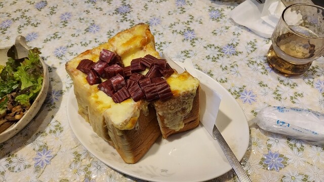 のんのん的香腸吐司,厚厚的麵包上鋪滿了豐富的香腸,光是外觀就讓人感到興奮!