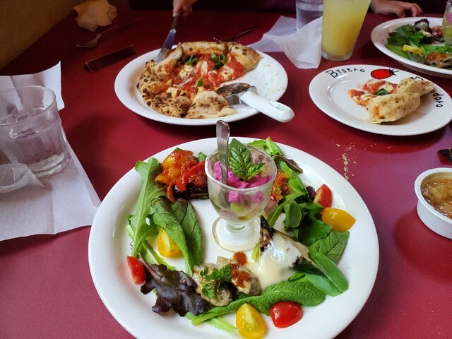 前菜份量十足,色彩繽紛!披薩的基本菜單是瑪格麗特披薩。雖然覺得有點小,但餅皮彈牙可口,味道很好。