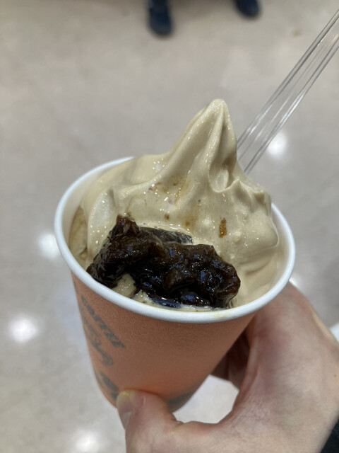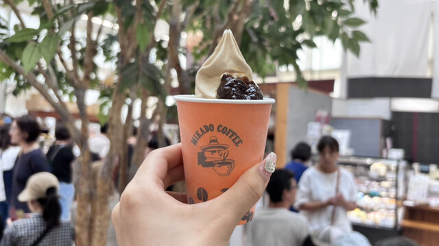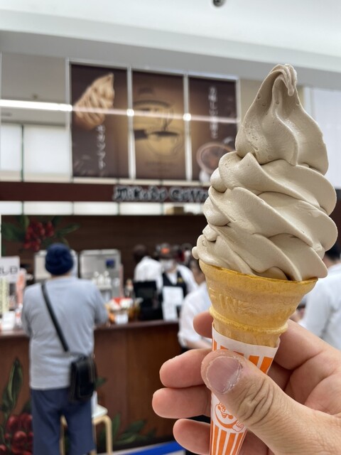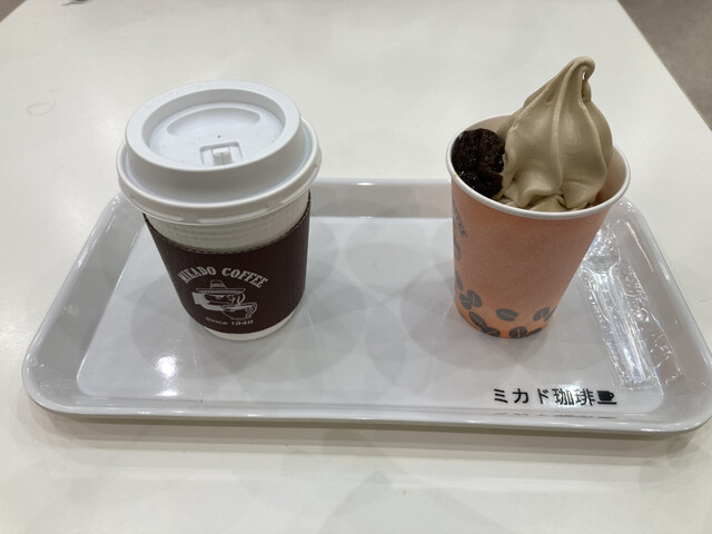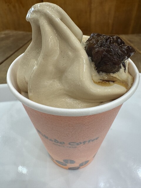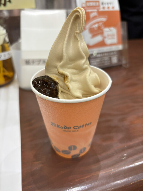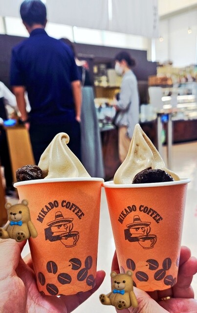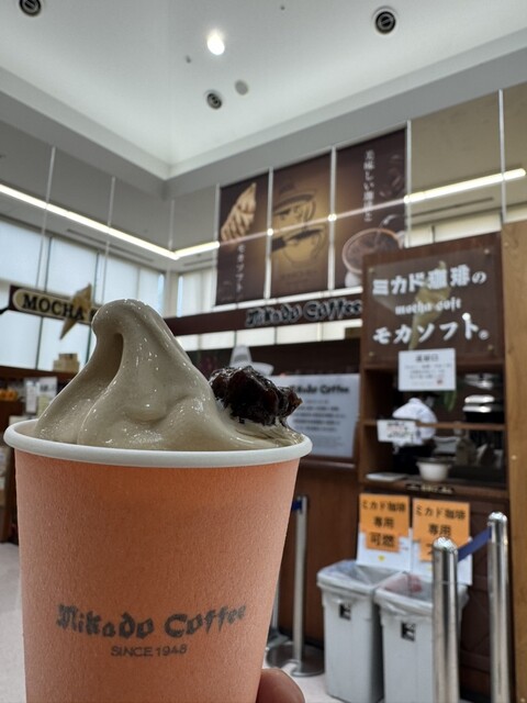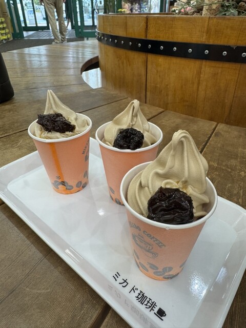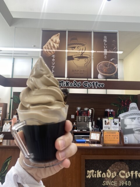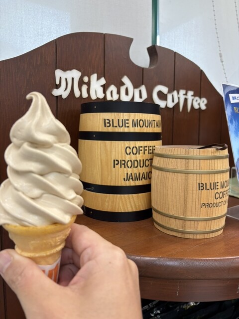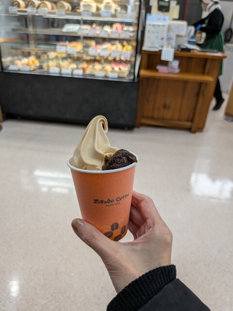 我在去ツルヤ購物時,於這家ミカド咖啡稍作休息。選擇了外帶,品嚐了摩卡冰淇淋。甜度適中,非常美味。此外,冰淇淋上面的梅乾也很好吃!