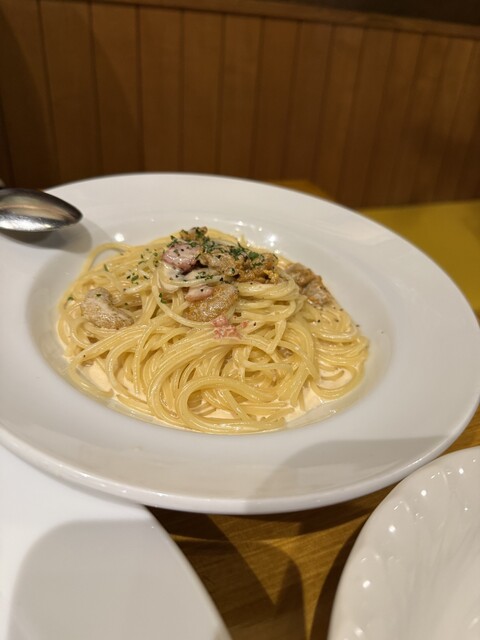 午餐有牛排套餐和今天的義大利麵套餐。義大利麵是鮭魚和蠶豆的奶油醬,味道...