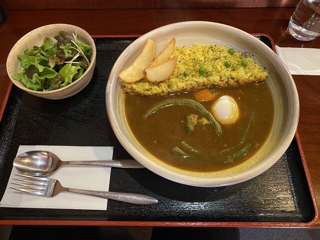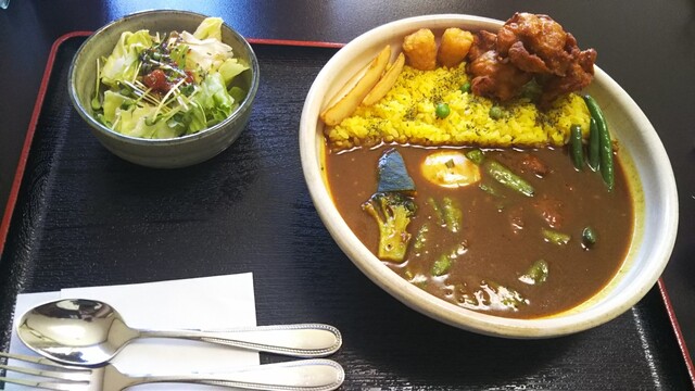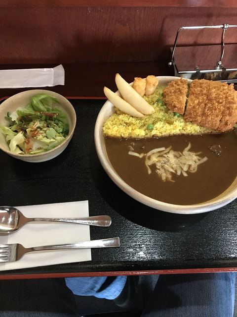 香辣咖哩(含稅800日圓)附沙拉,另加兩尾炸蝦(by 川井 潤)