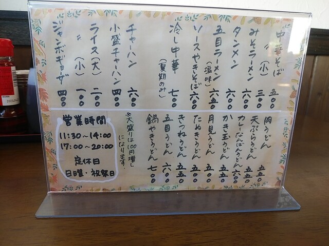 這是一家位於御代田町的食堂,但因為停車場狹小,所以我通常避開午餐時間。今天稍晚抵達,運氣不錯,剛好找到一個停車位在店前。進店後,我從菜單上點了大盛的坦麵,價格真划算。