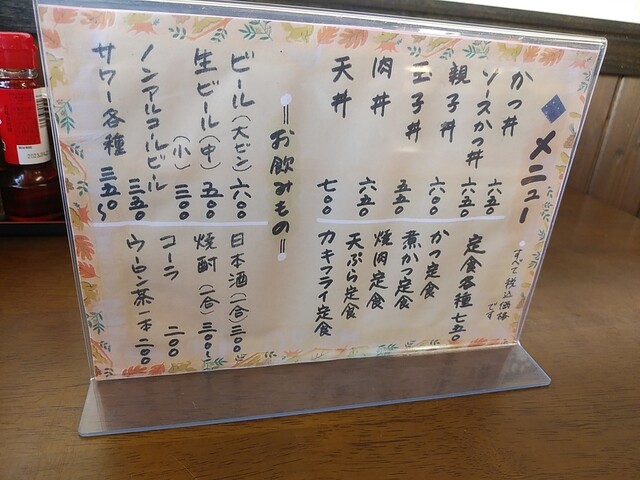 在御代田町的役場附近有一家小食堂。我一直想要去,但因為停車場太狹窄無法進去,今天因為人不多,所以很輕鬆地停好了車。推開暖簾走進店裡,看到桌子和榻榻米席位非常寬敞,讓我感到意外。左手邊有一張小桌和兩把椅子,還有一個90度的情侶座。我一個人坐下來,查看菜單,發現整體價格都很實惠。於是我選擇了炸豬排丼並下了單。店裡隨後也陸陸續續進來了不少客人。