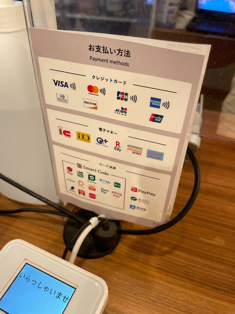 可信用卡付款 (VISA,Master,JCB,AMEX,Diners) 接受電子貨幣 (交通電子貨幣(Suica等),樂天Edy,nanaco,WAON,iD,QUICPay) 接受二維碼支付 (PayPay,au PAY) |