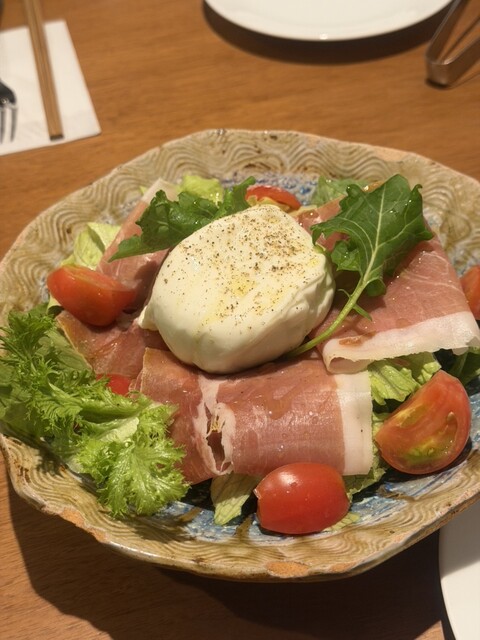 首先品嚐了布拉塔起司和生火腿沙拉。濃郁的起司融化,與鹹...