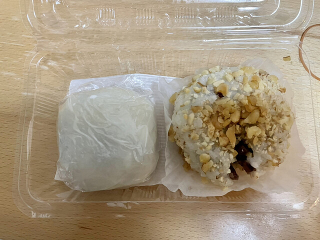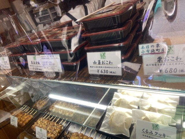 我是栗子迷,想買栗子飯,但那似乎是季節限定品,於是我選了兩種不同的飯:花豆飯和山菜飯。因為量對一個人來說有點多,我決定買了核桃麻糬和花豆大福!