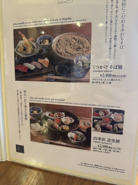 菜單上的項目較少,煮魚定食2860日圓,蕎麥天婦羅壽司套餐2640日圓,刺身定食2750日圓,還有海鮮丼3080日圓,天丼約2420日圓。