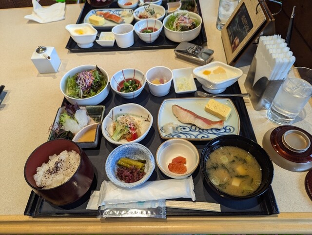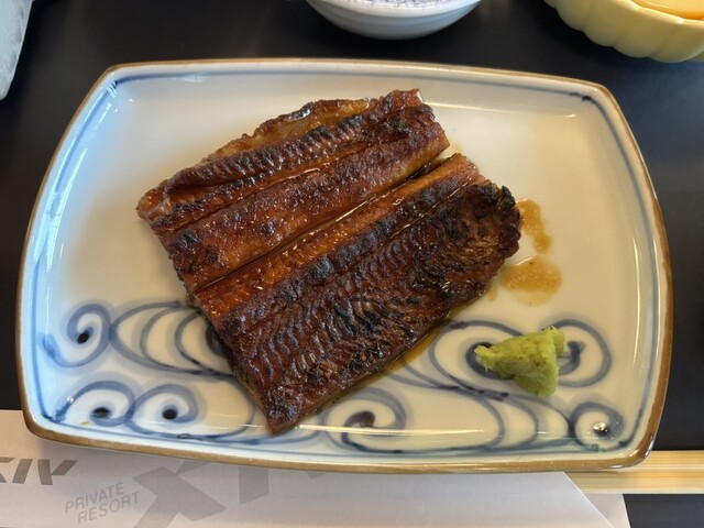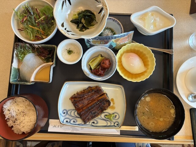首先享用了早餐。除了溫泉蛋、海苔、沙拉和煮魚等配菜外,主菜竟然是早上就有的鰻魚蒲燒,味道濃郁且美味。