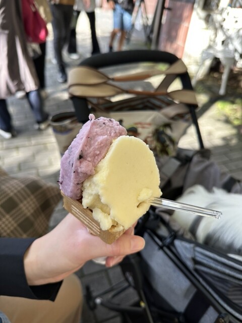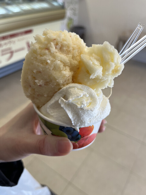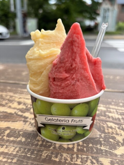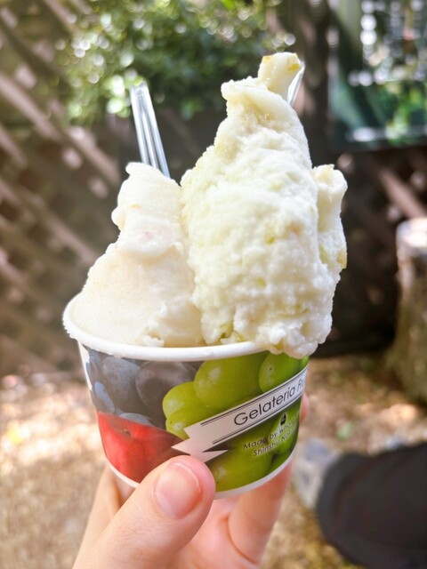 蘋果與長野紫葡萄雙球冰淇淋。蘋果口感清新、爽口且細膩,長野紫葡萄融入果皮,帶來如同完整水果般複雜的味道,並非甘甜或濃厚,而是手工製作的冰淇淋完美呈現了水果的特性。雖然雙球售價1,000日圓,算是觀光地...