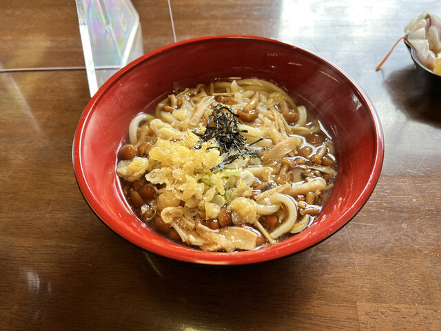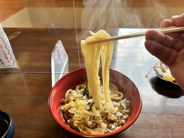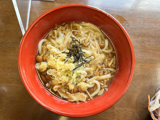 無論是誰都是對『限定』『特別』的字眼無法抵擋,更何況是我這個浮躁的代表,當然不會錯過這個機會,因此毫不猶豫地點了它。店裡的阿姨親切地告訴我:「好的!請稍等!」隨即呈現的是盛在紅黑色塑膠碗中的烏龍麵。裡面有大量的滑菇、金針菇、舞茸等各式香菇,棕色滑嫩的烏龍麵非常暖和且美味。而這次的享受不止於此。