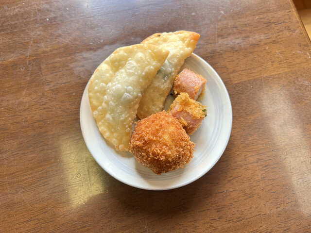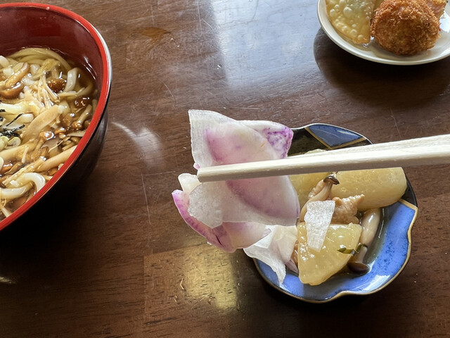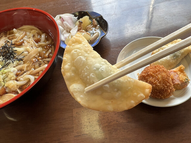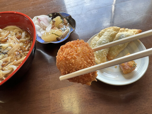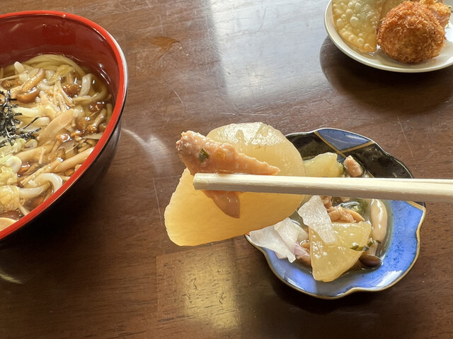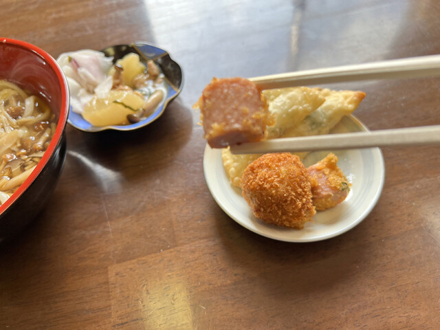 這是只對點了烏龍麵的客人提供的小菜自助餐。雖然只有三種炸物和一種煮物,以及一品醃菜,但這些小菜實在是令人感到愉悅。