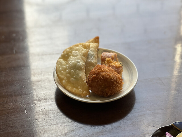用煮熟的南瓜捏成圓球後炸製的簡單可樂餅,外脆內軟,甜美的味道,有著濃濃的昭和感。估計這是最費工的菜餚吧。