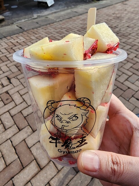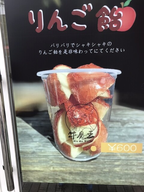 切好的裹著糖的蘋果。因為已經切好,比一般的蘋果糖更容易食用,而蘋果本身也非常美味。糖的厚度比一般的還要薄,吃起來略帶一點甜味,與蘋果的味道完美結...
