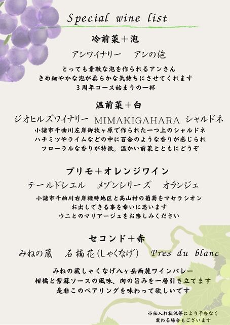 由工作人員精心挑選的長野葡萄酒搭配(by 餐廳)