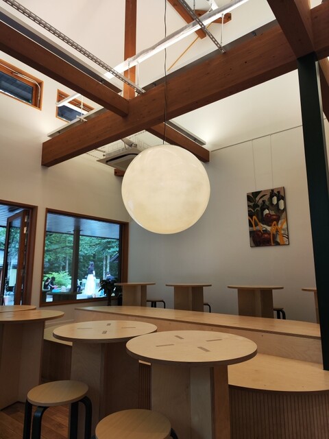 店內以木材為基調,彷彿融入了哈爾尼雷露台周圍的自然環境。圓圓的大燈具如滿月般美麗。