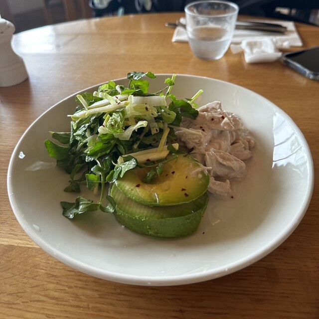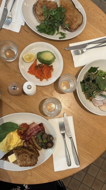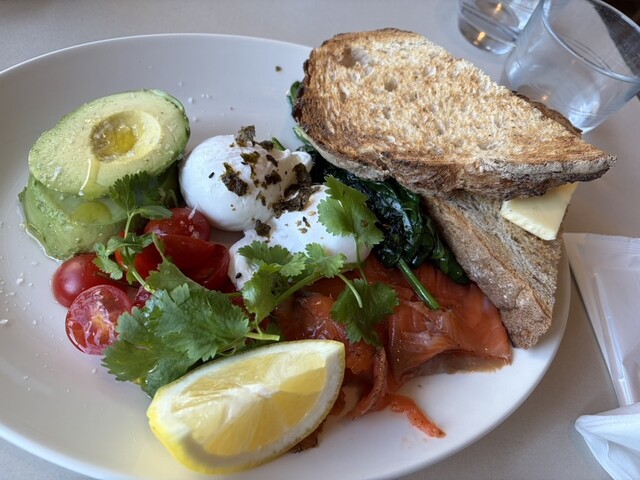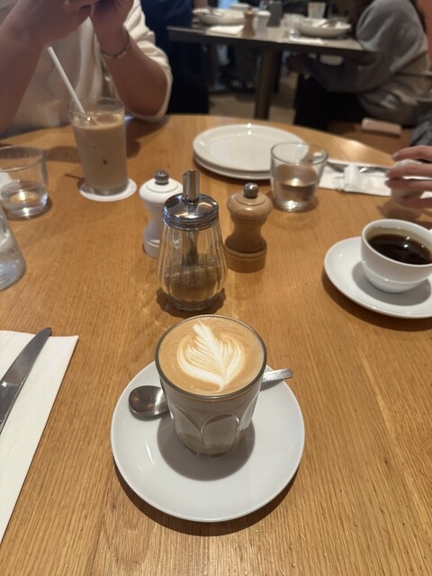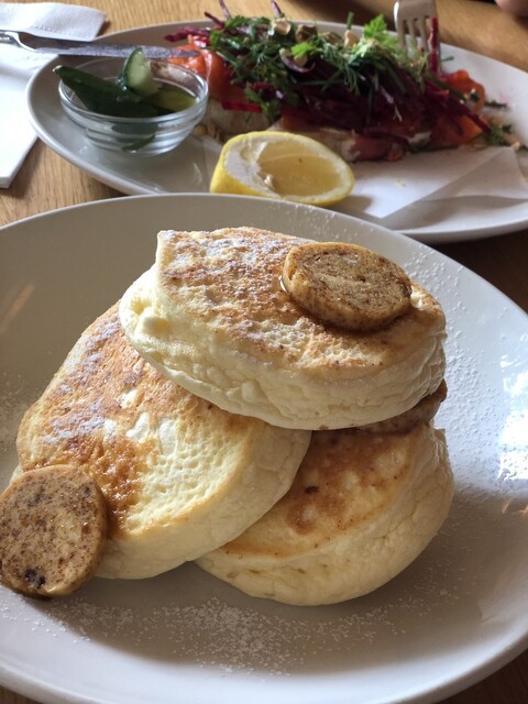 我們點了瑞可塔起司鬆餅和附有鮭魚的麵包套餐,飲品則是咖啡拿鐵和焙茶拿鐵。焙茶拿鐵濃郁且...