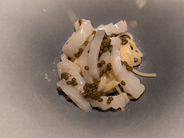 新鮮捕獲的青魷魚與奧西特拉魚子醬冷製費德里尼。