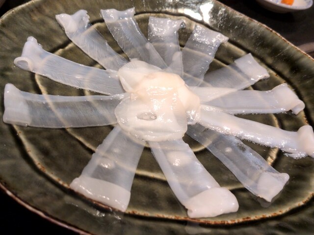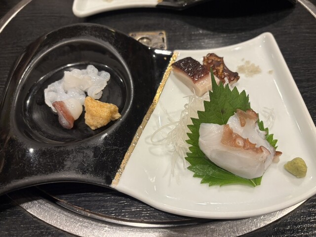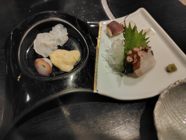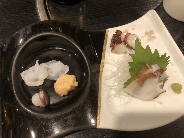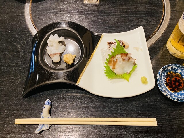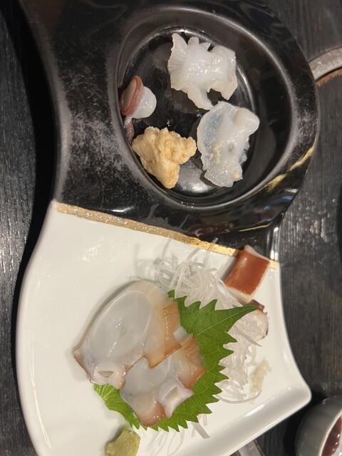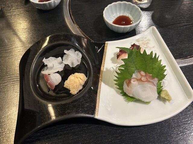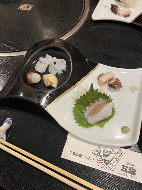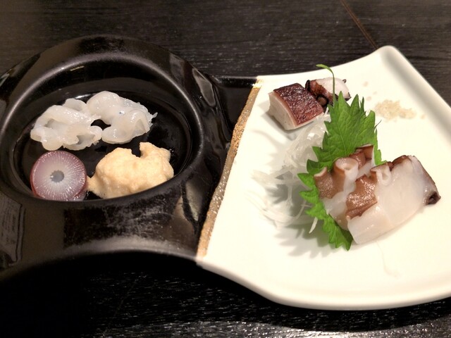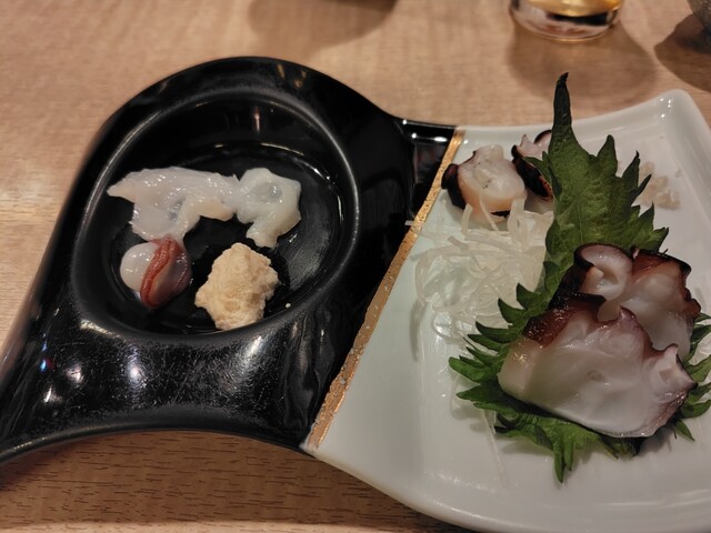 水蛸和真蛸的刺身,真蛸的腳和塊狀部分搭配了...