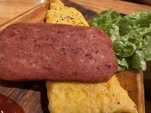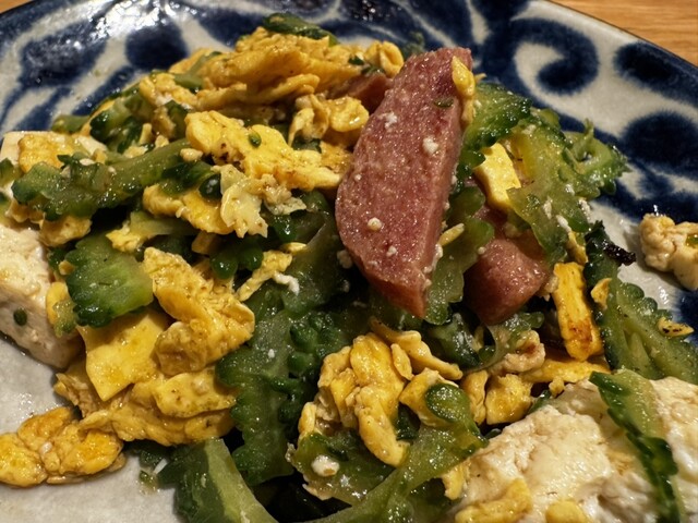 →使用了苦瓜、豆腐、午餐肉和雞蛋的炒菜。雞蛋滑嫩,午餐肉也厚實多汁,苦瓜苦味不重,十分美味!