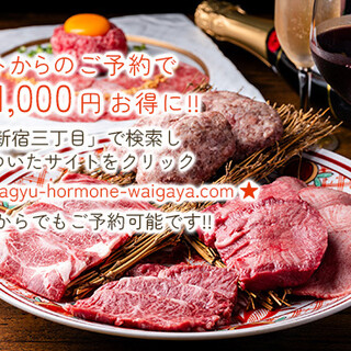 新宿東口步行5分鐘。24小時營業◎包含A4等級高級燒肉的炭火燒肉及正宗韓國料理等70種任吃!女性只需\3,480、男性\3,980,驚人的價格享受任吃任飲★包場可容納30至60人。