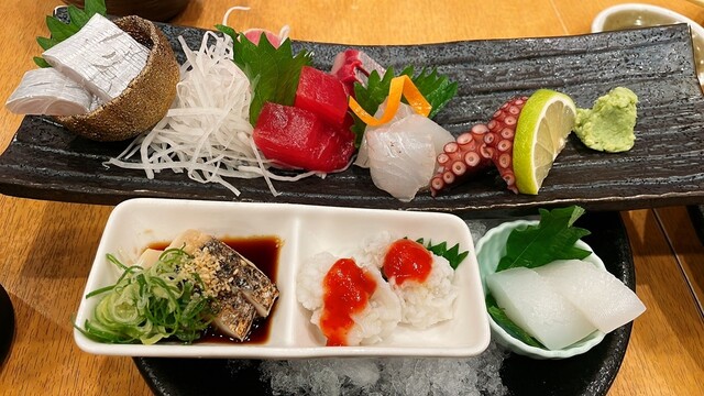 まずは 名物お造り盛り合わせ(1,580円) を注文。どの魚も新鮮で、特にサワラのタタキ(1,280円)は香ばしい風味と脂のノリが絶妙でした。