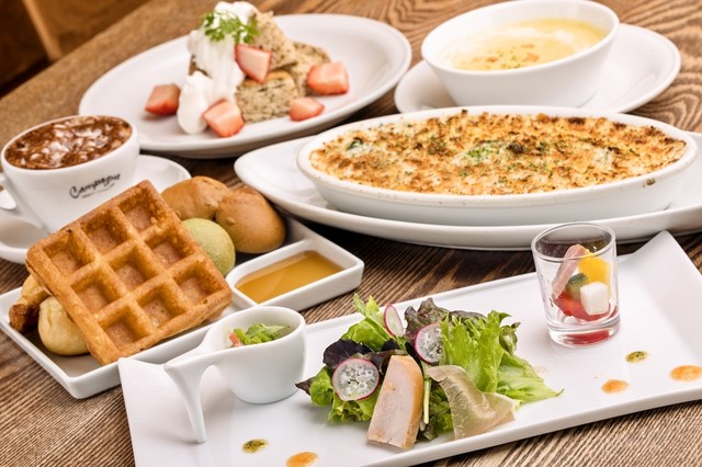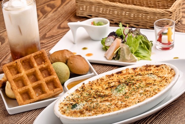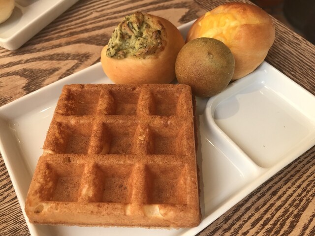 店内で焼き上げたパン(orワッフル)の食べ放題がついて、とても人気。