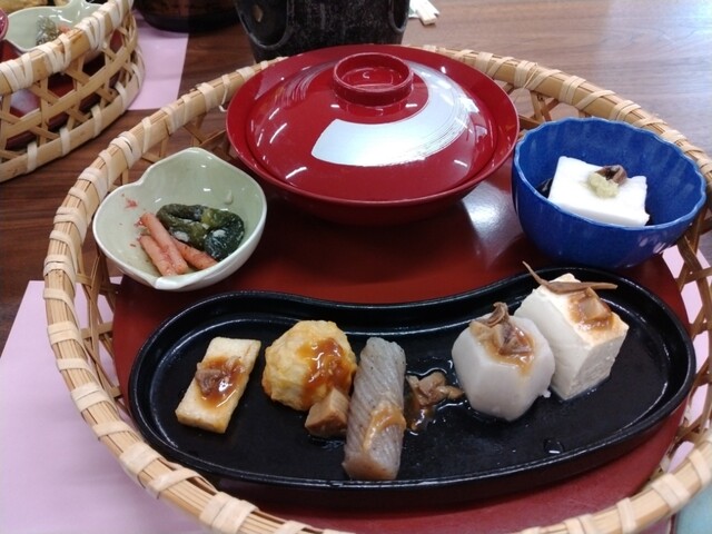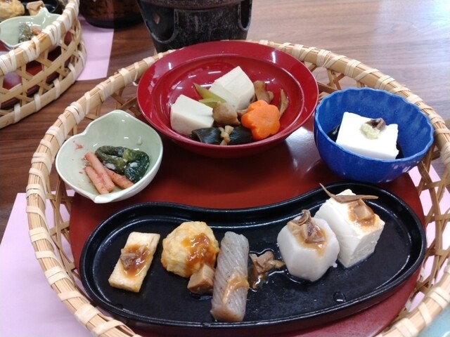 精進料理だけでなく、プラスして豚冷しゃぶや鶏鍋などがある、基本は団体客向けツアーセットを指向したメニュー設定。胡麻豆腐、高野豆腐抱き合わせ、刺身こんにゃく、こんにゃく麺、豆腐ハンバ... 詳細を見る
