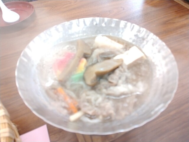 精進料理だけでなく、プラスして豚冷しゃぶや鶏鍋などがある、基本は団体客向けツアーセットを指向したメニュー設定。胡麻豆腐、高野豆腐抱き合わせ、刺身こんにゃく、こんにゃく麺、豆腐ハンバーグ、かき揚げ、串揚げ、豚冷しゃぶ、大福他。薄味で美味しい。