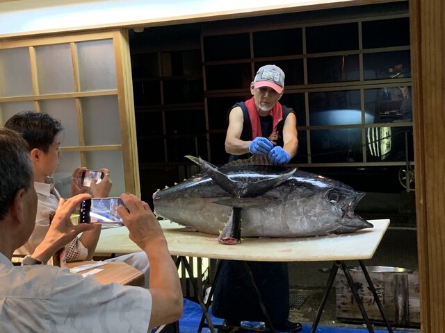 お食事処「桂城」の板さんがマグロの頭をさばきます |