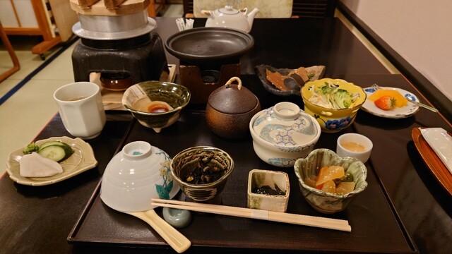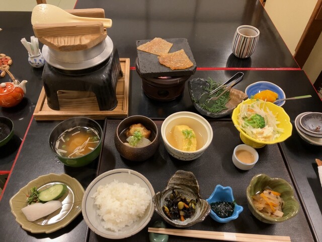 品数豊富の朝食。何をおいても釜炊きで供される純白のごはんは絶品だ。炊きたての熱々を食べられるのは米好きにとっては至高だろう。釜の蓋を取った瞬間に立ち上る炊きたての湯気に食欲をそそられる。
