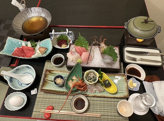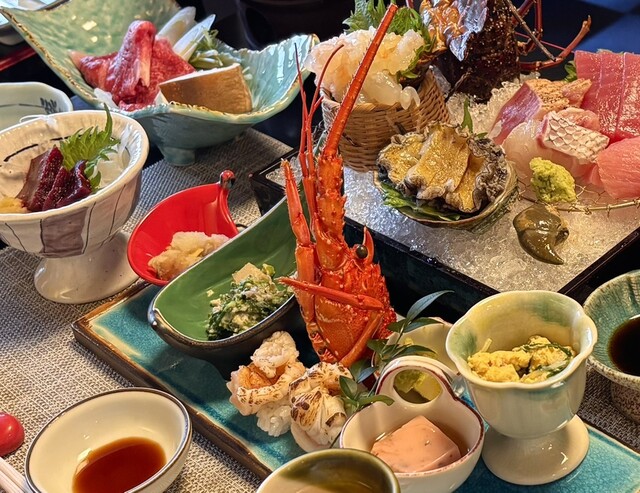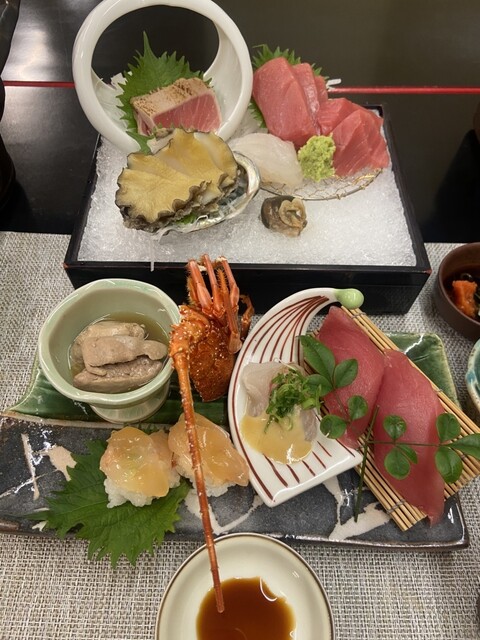 今回はチョッと贅沢して伊勢海老が入ったコースを頼んだところ、伊勢海老は御造りと握り寿司になっていて和歌山名物の生マグロや地魚と鯨に牛肉...