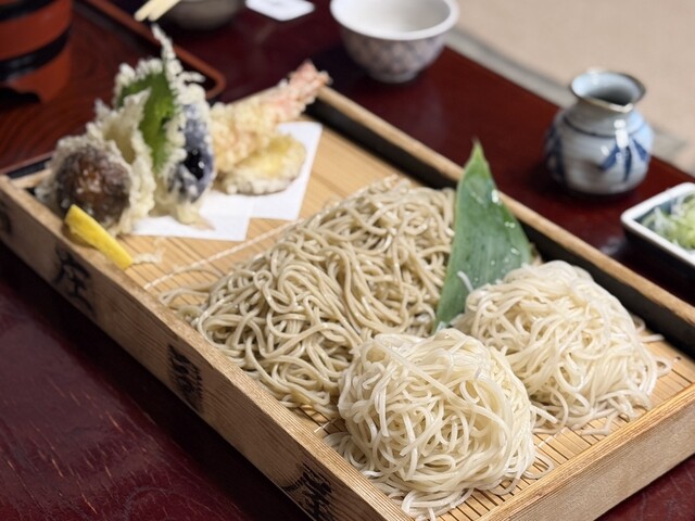 今回は「相森板そば(2,600円)」を注文。天ぷらと、さらしなそば、そして山形らしい田舎系のそばの二種類を楽しめる内容です。