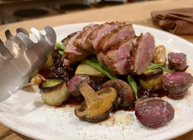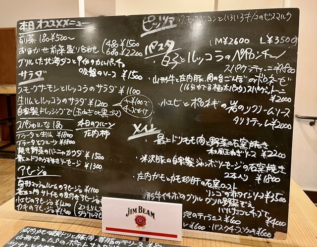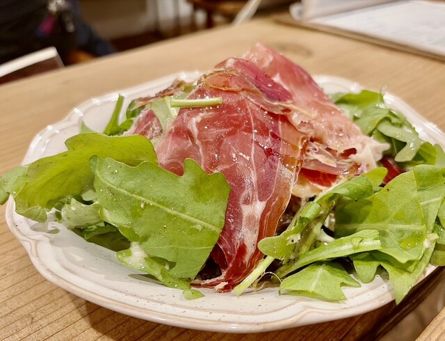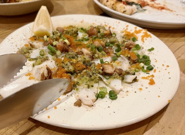 生ハムとルッコラのサラダ(オニオンソース)、マルゲリータ、自家製フォカッチャ、甲イカのカルパッチョ吸盤ソース、白子のアヒージョ、ボロネーゼ、庄内カモとカモの砂肝の石窯ローストりんごの赤ワインソース、スパークリングミニボトル、イタリア産シャルドネボトル
