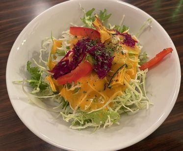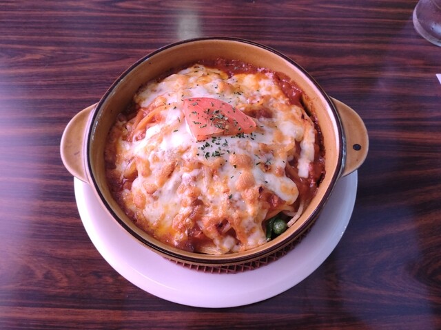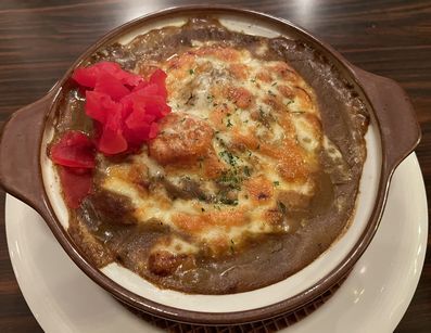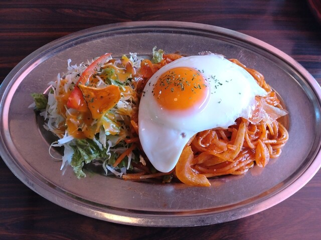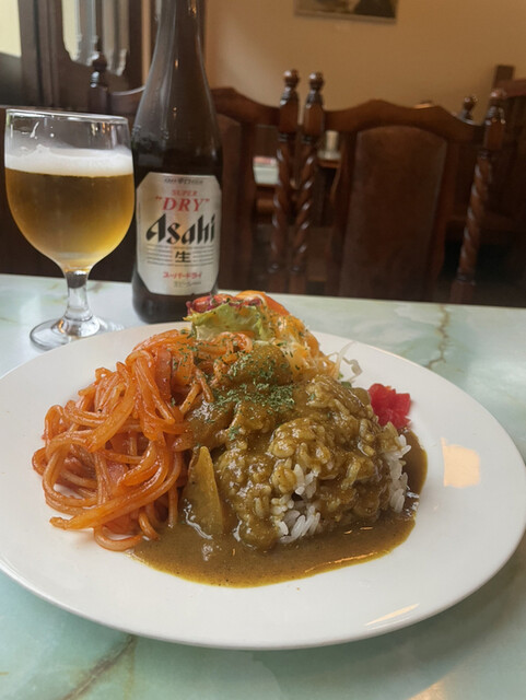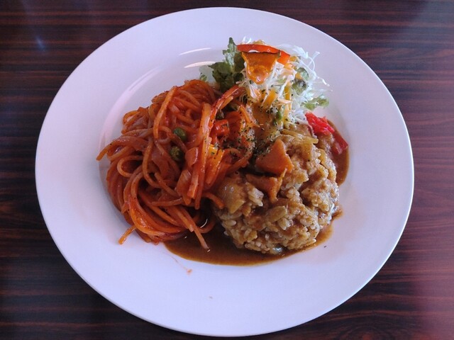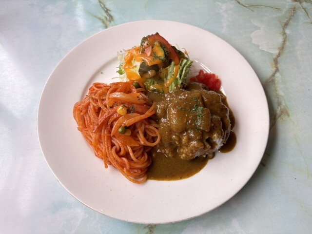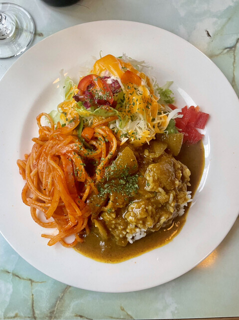 メニューはカレーが多く、カツカレー、ハンバーグカレー、カレースパゲティ、カレードリア、薬膳カレーなどが揃っています。今回はナポリタンとカレーとサラダが盛り合わせになっていて、...