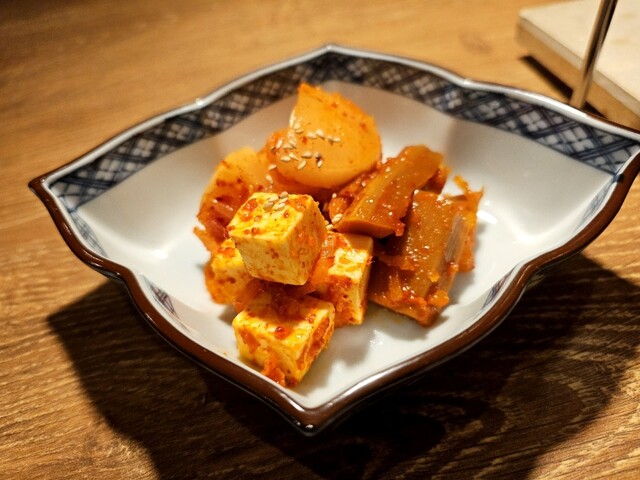まずはキムチとナムルの盛り合わせ。キムチは沢庵、チーズ、メンマ、ナムルは色んな野菜がのった珍しいやつ。