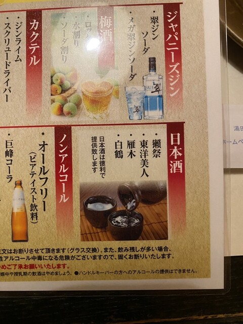 | ドリンク | 日本酒あり、焼酎あり、ワインあり、カクテルあり、日本酒にこだわる、焼酎にこだわる、カクテルにこだわる |