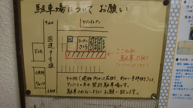 有 他の店と共有で店前に無料駐車場約20台、正確にはお店直前に3台ほど |
