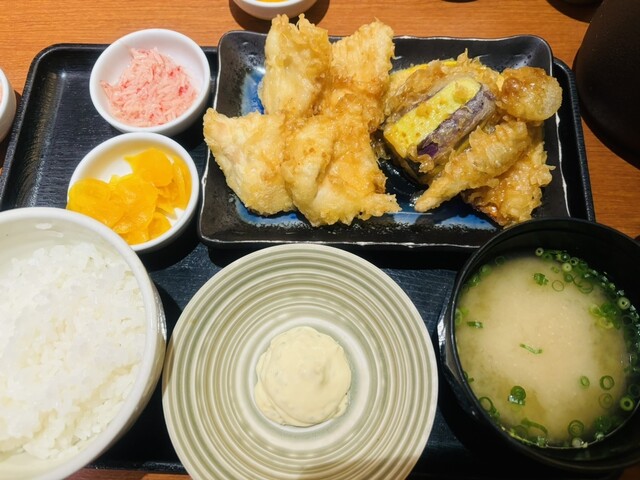 チキン南蛮定食(1188円) 天ぷら屋だがこの日はチキン南蛮を。 天ぷら同様に揚げた鶏、ナス、かぼちゃに甘酢を和えたもの。タルタルソースが添えられる。 味噌汁が甘めの味噌... 詳細を見る